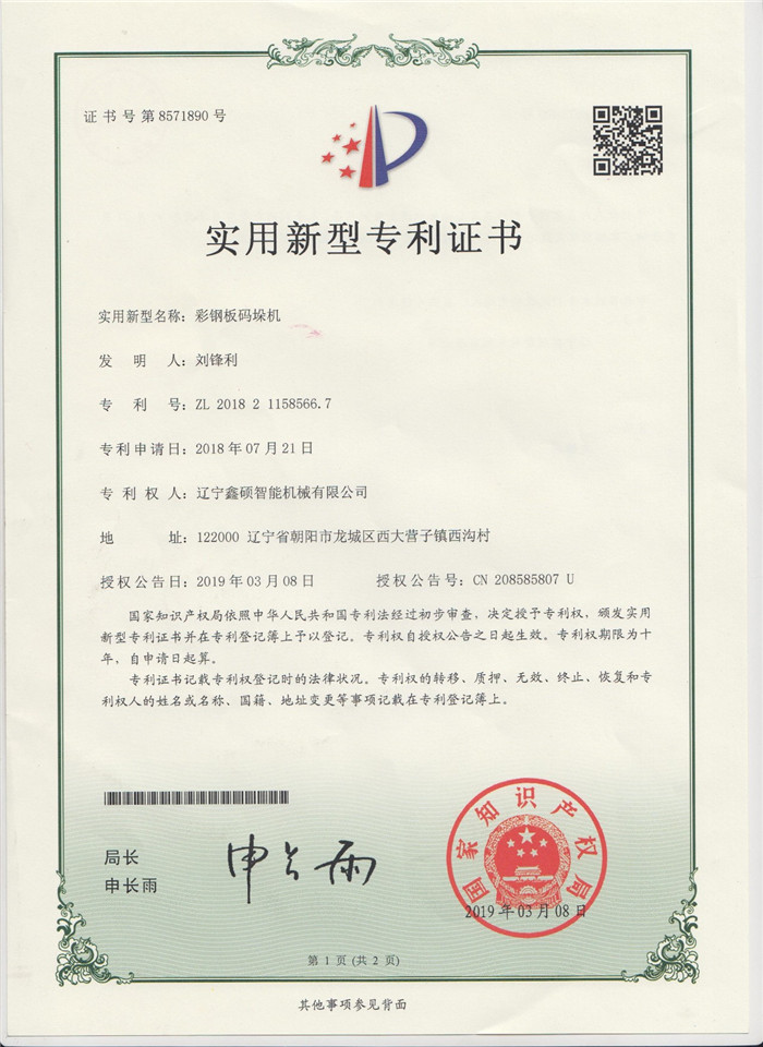 Utility model certificate of color steel plate palletizer