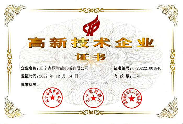 根據(jù)《高新技術(shù)企業(yè)認(rèn)定管理辦法》(國科發(fā)火〔2016〕32號)和《高新技術(shù)企業(yè)認(rèn)定管理工作指引》(國科發(fā)火〔2016〕195號)有關(guān)規(guī)定,憑借雄厚的研發(fā)隊伍、專業(yè)的技術(shù)實力、持續(xù)的創(chuàng)新能力及科學(xué)的企業(yè)管理,經(jīng)過各部門嚴(yán)格的測評和層層審批,遼寧鑫碩智能機械有限公司正式被認(rèn)定為國家級高新技術(shù)企業(yè)。