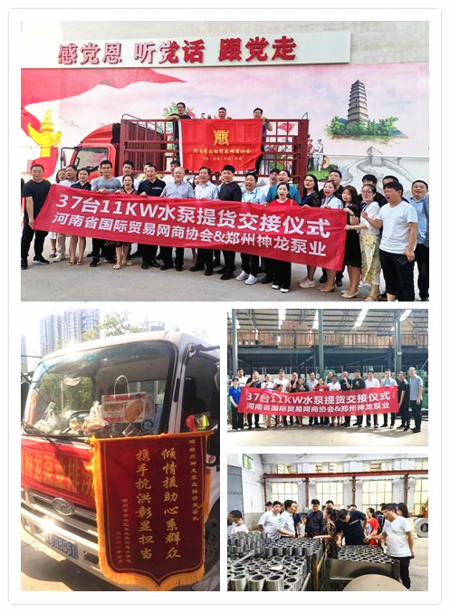 河南國際貿(mào)易網(wǎng)商協(xié)會(huì)、神龍泵業(yè)水泵提貨交接,未來路街道贈(zèng)神龍排澇突擊隊(duì)錦旗